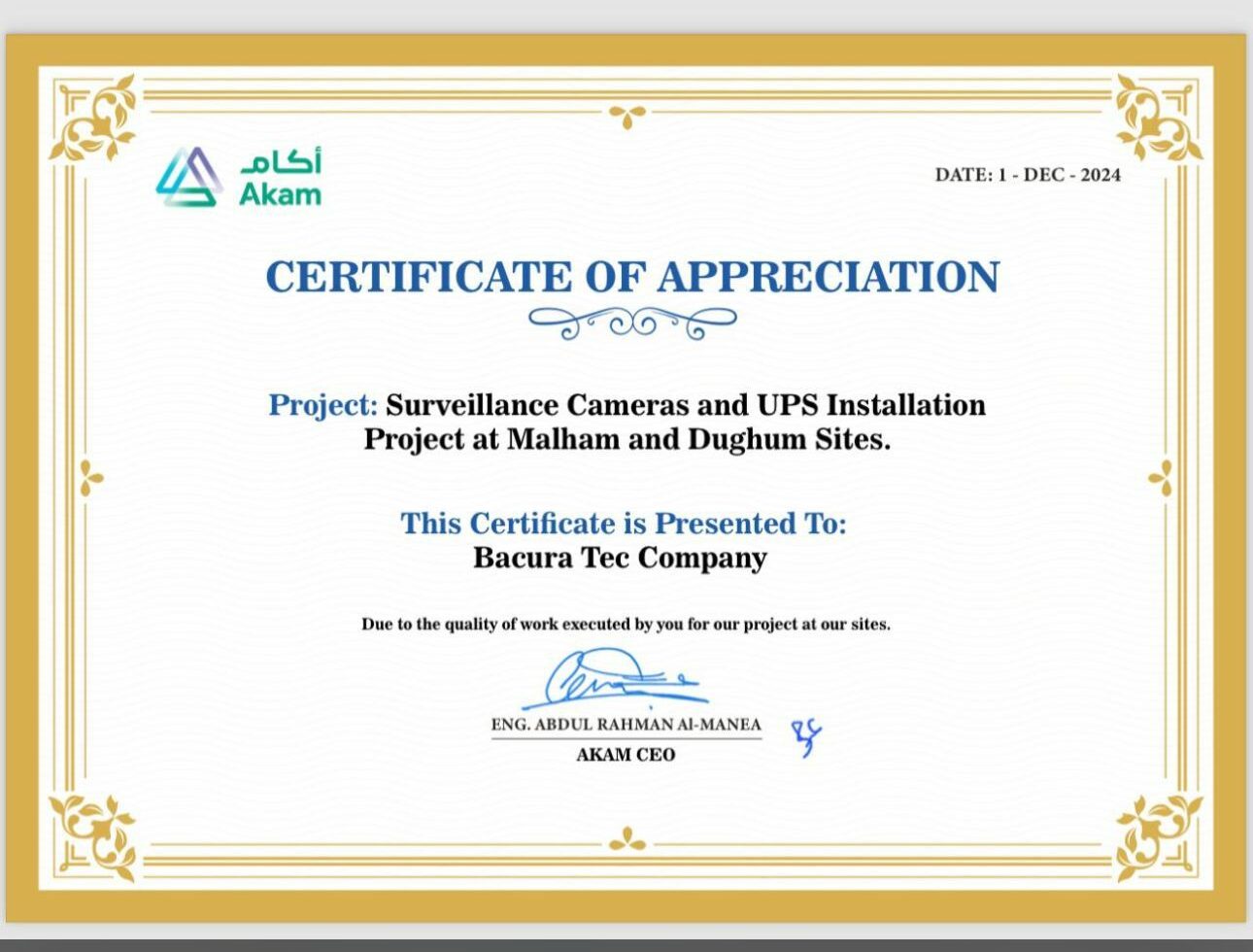 في خطوة تعكس مدى التزامها بتقديم خدمات تقنية عالية الجودة، حصلت شركة باكورة التقنيات على شهادة شكر وتقدير من شركة أكام، التابعة لصندوق الاستثمارات العامة السعودي، وذلك تكريمًا لنجاحها في تنفيذ مشروع تركيب كاميرات المراقبة ونظام الطاقة الاحتياطية (UPS) في موقعي ملهم والدغم بمدينة الرياض.